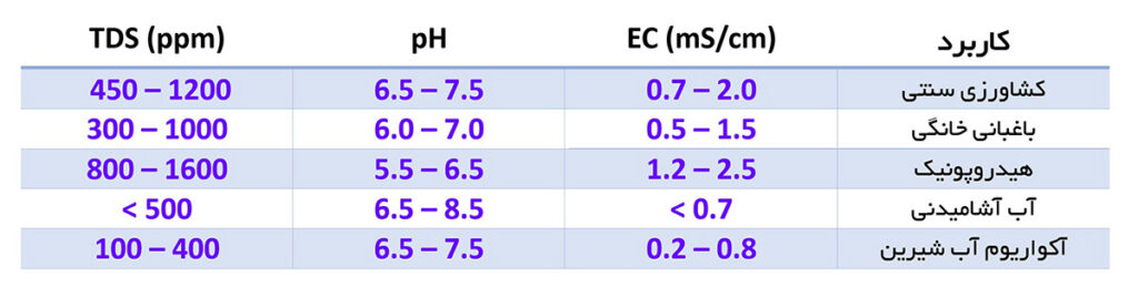 مقادیر EC و ph و TDS مناسب برای کاربردهای مختلف
