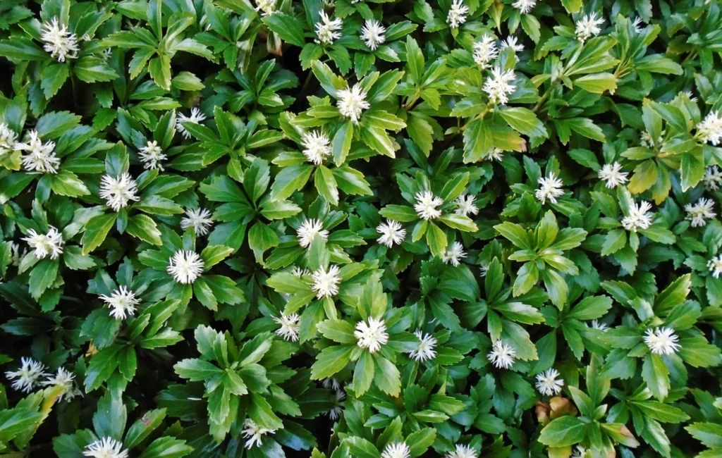 پوشش زمینی پرپشت مناسب برای سایه که به‌تدریج از طریق ریزوم‌ها گسترش می‌یابد و فرشی از شاخ و برگ‌های براق و سبز زمردی تشکیل می‌دهد. برگ‌های بیضی‌شکل در اوایل بهار توسط سنبله‌های کوتاه گل‌های سفید پوشانده می‌شوند. اگرچه شکوفه‌های معطر عمر کوتاهی دارند، شاخ و برگ همیشه سبز آن در طول سال جذاب باقی می‌ماند. همچنین می‌توانید گیاه “Allegheny spurge” (Pachysandra procumbens)، یک گونه بومی آمریکایی با برگ‌های سبز آبی که در پاییز به رنگ برنز در می‌آید، امتحان کنید.