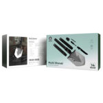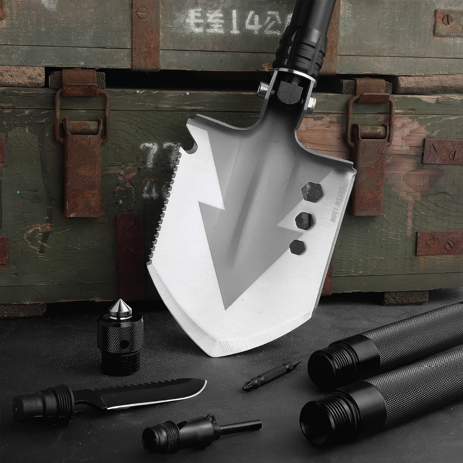 در طراحی GNMLTSHLBK، بیش از یک ابزار در یک بدنه تعبیه شده است که شامل بیل اصلی تیز و کاربردی بهعلاوه ابزارهایی مثل آچار ششگوش بیرونی در سایزهای 16، 14 و 12 میلیمتر، اره کوچک، تیغه برش طناب، چاقو، استارت آتش، شیشهشکن، بطری بازکن، پیچگوشتی فیلیپس و شیار، سوت و ابزار برش (کاتر) هستند. این ابزارها باعث شدهاند تا این محصول صرفاً یک بیل نباشد و مجموعهای کامل از ابزارهای ضروری را در اختیار شما قرار دهد. سبک طراحی جمعوجور و قابلحمل همراه با وزن مناسب باعث میشود تا بتوانید این بیل چندکاره را بهراحتی در کولهپشتی، صندوق عقب خودرو و تجهیزات کمپینگ جا دهید و در موقعیتهای مختلف از آن استفاده کنید.