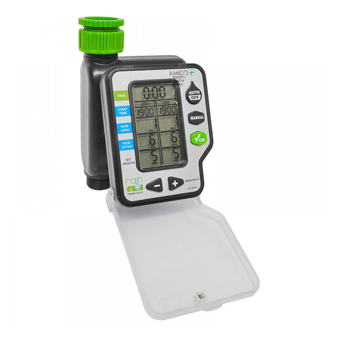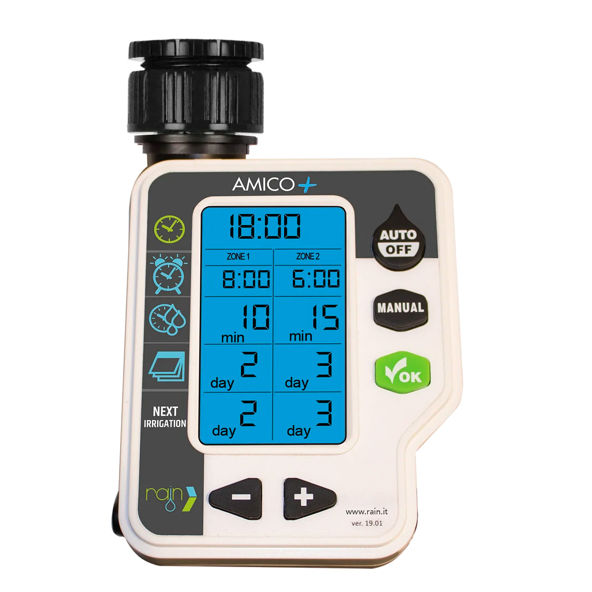تایمر آبیاری دو کانال RAIN مدل 2+Amico از برند معتبر RAIN ایتالیا نسخه پیشرفته مدل +Amico است که برای کنترل دو ناحیهی آبیاری مجزا طراحی شده است. این مدل با داشتن دو خروجی (دو کاناله)، امکان تنظیم جداگانه برای هر مسیر آبیاری را فراهم میکند؛ بهعنوان مثال میتوانید یک مسیر را برای گلدانها و مسیر دیگر را برای چمن یا باغچه تنظیم کنید.