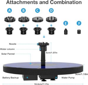 این پمپ دارای طراحی شناور است و تنها در عمق حداقل ۲.۵ سانتیمتر آب عملکرد مطلوب دارد. به کمک ۶ نازل مختلف میتوانید الگوهای گوناگونی از پاشش آب را انتخاب کنید. سیستم بهصورت خودکار در برابر سایه و کمبود نور واکنش نشان داده و بسته به شدت نور خورشید ارتفاع پاشش را تنظیم میکند.