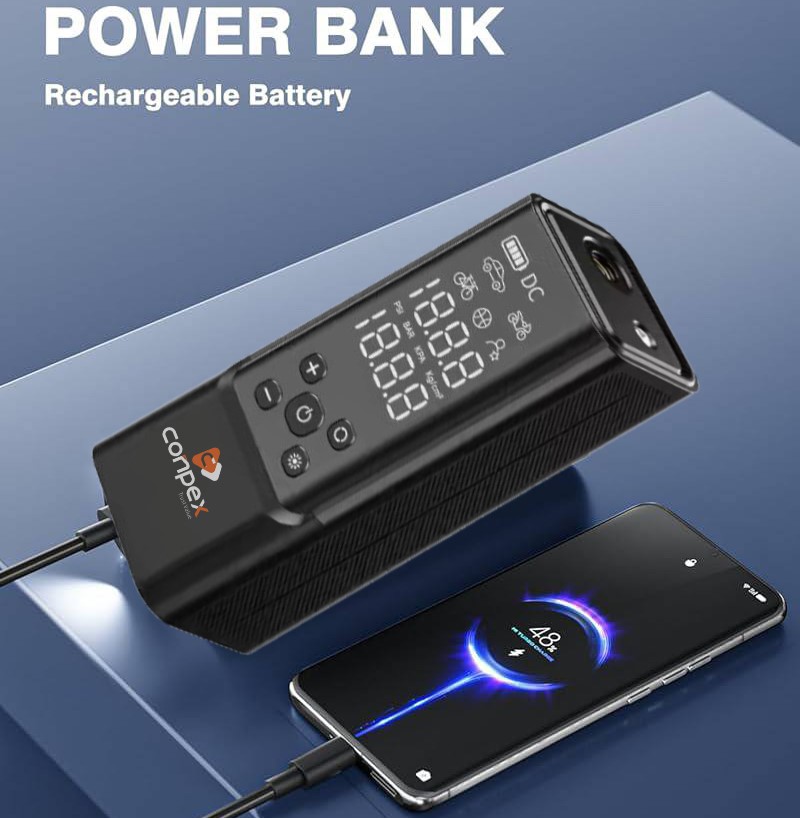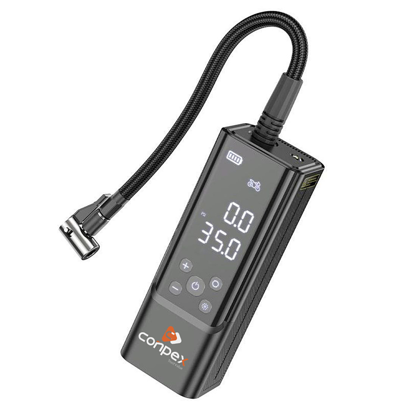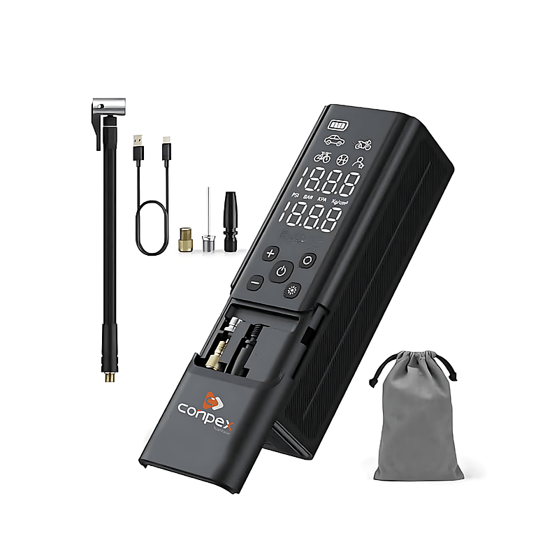 پمپ باد شارژی Conpex یک دستگاه حرفه‌ای و قابل حمل برای همه‌ی افرادی است که به دنبال راه‌حلی سریع و مطمئن برای باد کردن لاستیک خودرو، موتورسیکلت، دوچرخه و حتی توپ‌های ورزشی هستند. این کمپرسور پرتابل مجهز به نمایشگر دیجیتال با نور پس‌زمینه است که امکان مشاهده‌ی فشار باد را در واحدهای مختلف (PSI، BAR، KPA و Kg/cm²) فراهم می‌کند.