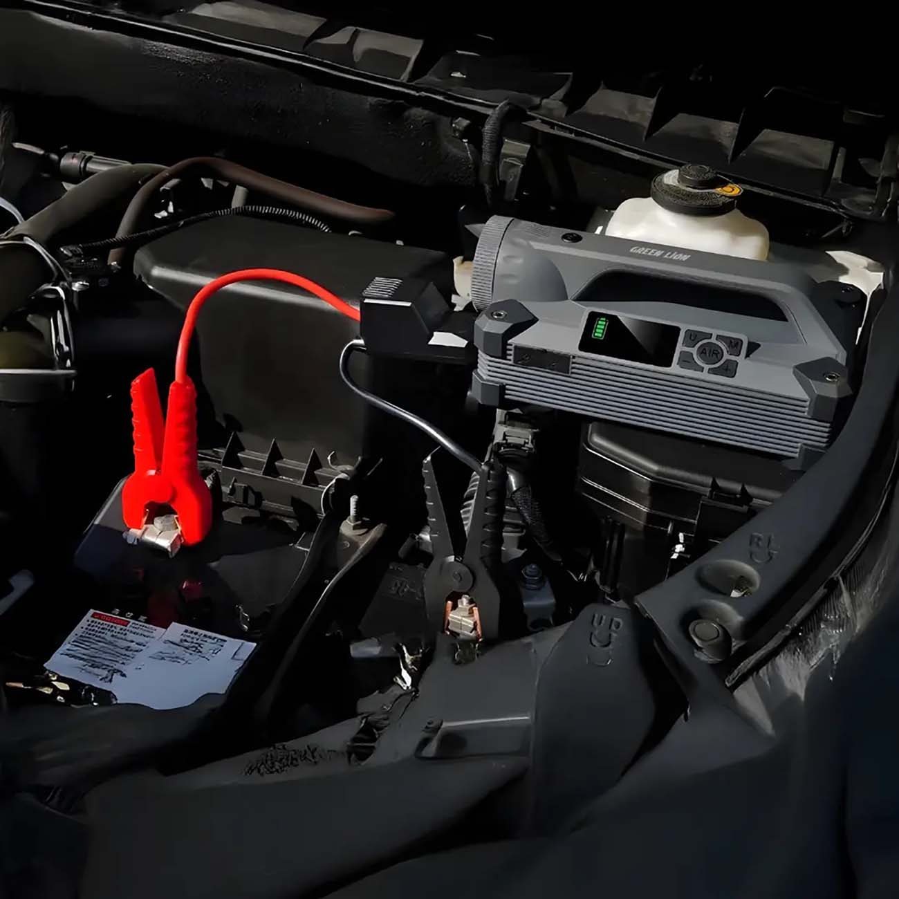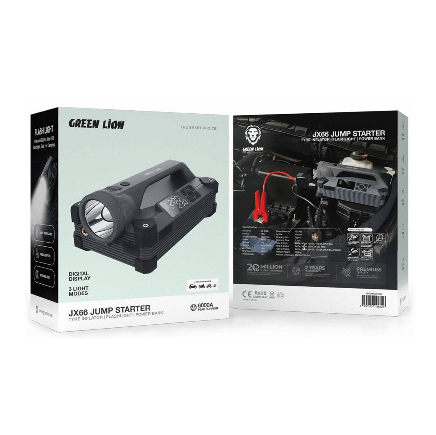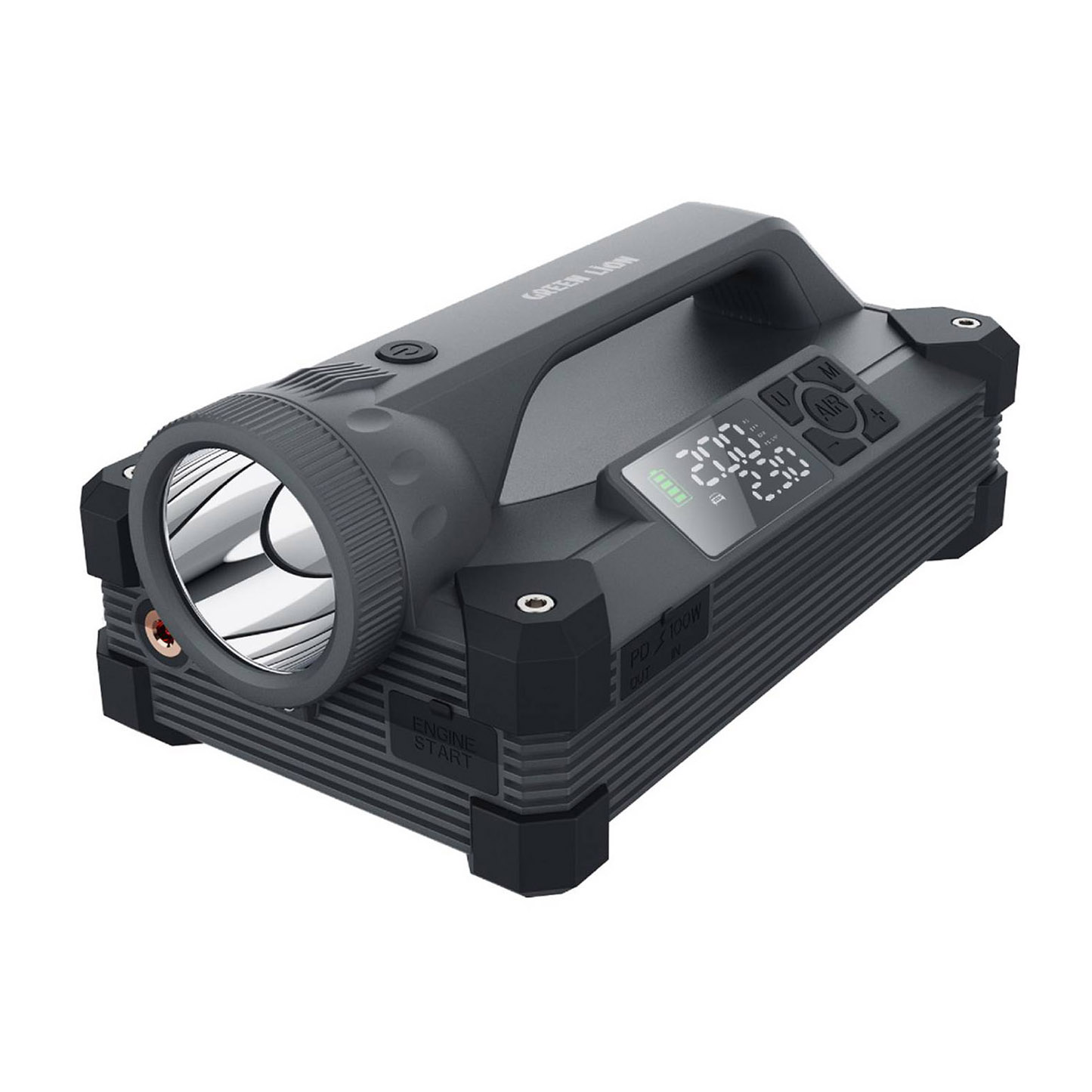 پمپ باد و جامپاستارتر گرین لاین Green Lion JX66 یک ابزار کامل برای شرایط اضطراری خودرو، سفر، کمپینگ و استفاده روزمره است. این دستگاه با ترکیب چهار قابلیت حیاتی جامپاستارتر خودرو، کمپرسور باد 150PSI، پاوربانک پرقدرت و چراغ LED فوقالعاده روشن ؛ یکی از کاملترین ابزارهای قابل حمل در بازار محسوب میشود. این مدل با ظرفیت 24000mAh و جریان پیک تا 6000A قادر است انواع خودروهای 12 ولت را در کمترین زمان روشن کند. پمپ باد داخلی آن با فشار 150 PSI و سرعت حدود 40 لیتر در دقیقه برای باد کردن لاستیک خودرو، موتور، دوچرخه، توپ یا تجهیزات کمپینگ کاملاً مناسب است.