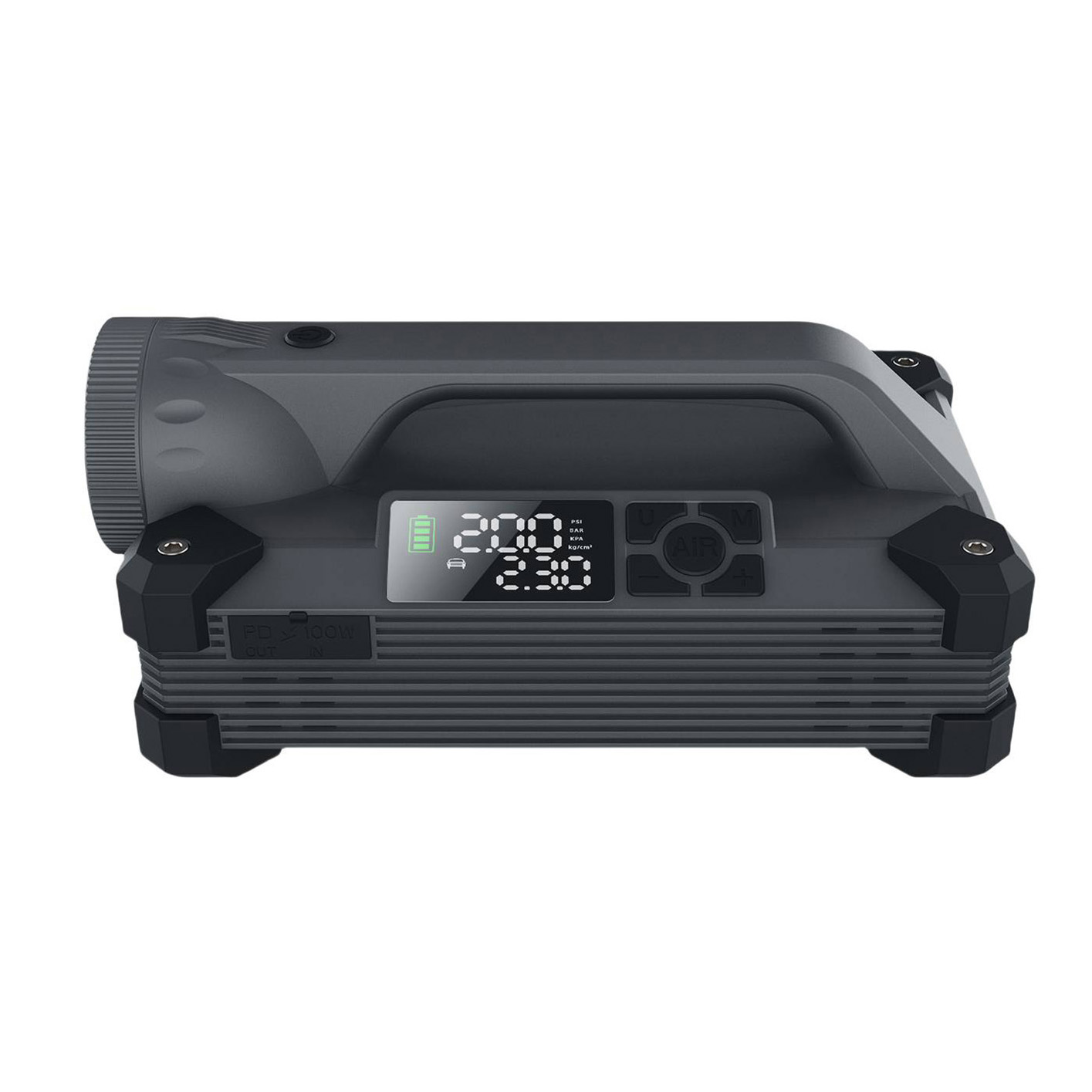 بدنه از جنس ABS مقاوم ساخته شده و نمایشگر دیجیتال وضعیت شارژ، فشار باد و حالت عملکرد دستگاه را نمایش میدهد. زمان شارژ دستگاه حدود ۲ ساعت است و همراه با نازلهای باد، کابلها و گیرههای جامپاستارتر ارائه میشود.