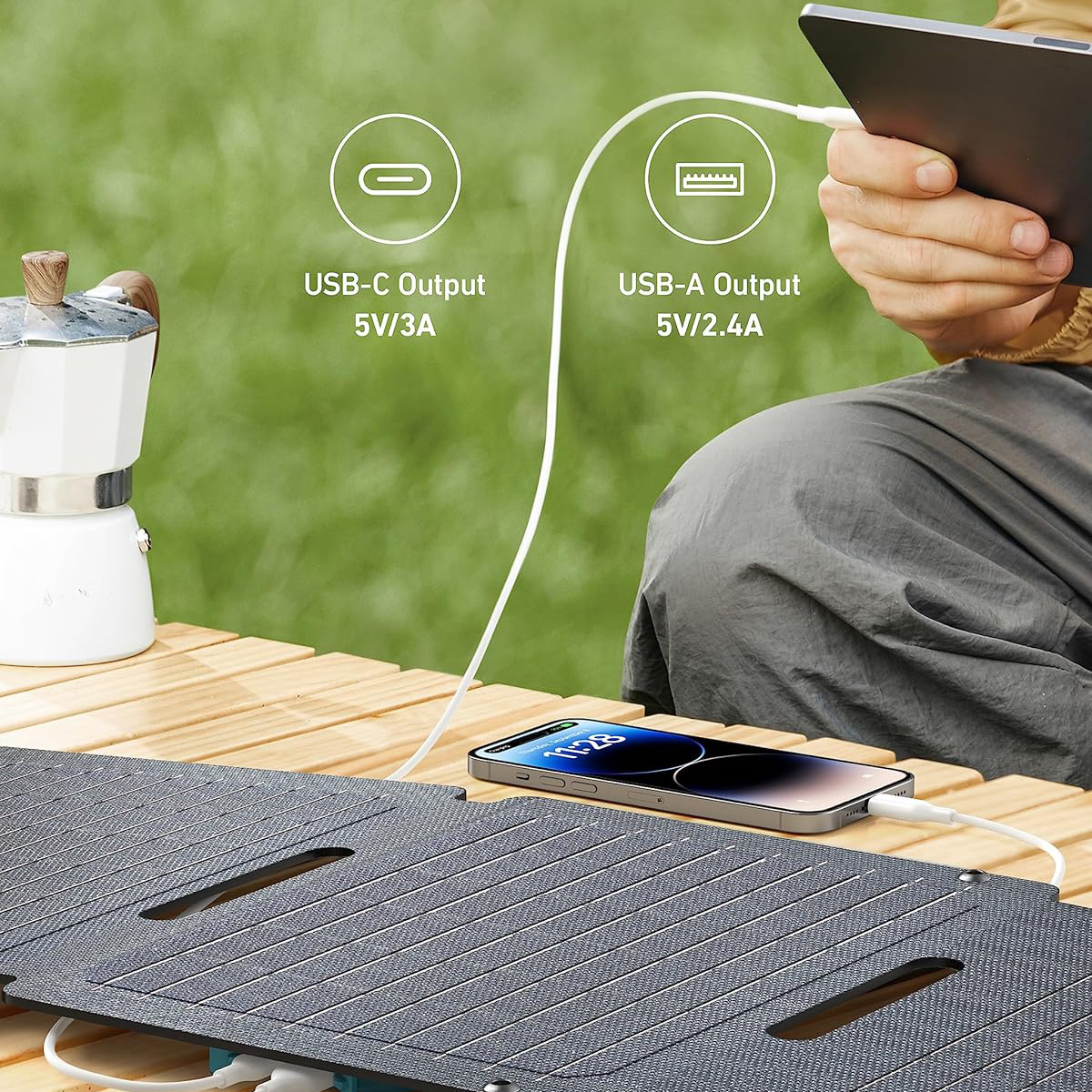 پنل Anker Solix PS30 دارای دو خروجی مجزا شامل USB-C با توان ۵V/۳A و USB-A با توان ۵V/۲.۴A است. این ترکیب باعث می‌شود بتوانید به‌طور هم‌زمان دو دستگاه را با سرعت بالا شارژ کنید؛ از گوشی و تبلت گرفته تا اسپیکر، چراغ کمپینگ یا پاوربانک. تراشه‌ی هوشمند داخلی (PowerIQ) جریان مناسب را برای هر دستگاه به‌طور خودکار تنظیم می‌کند تا شارژی ایمن و سریع فراهم شود.